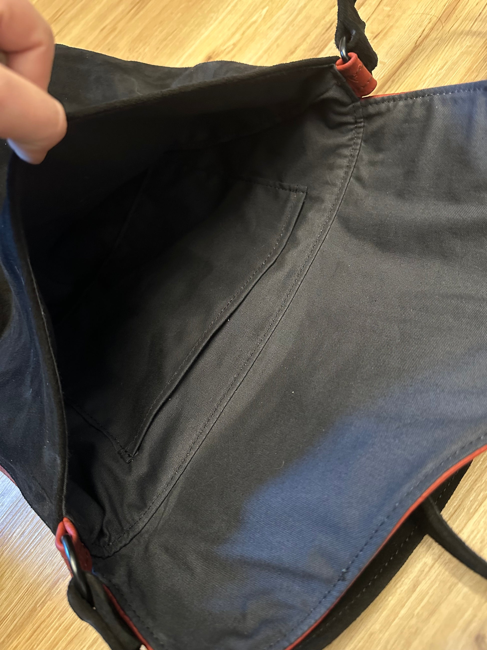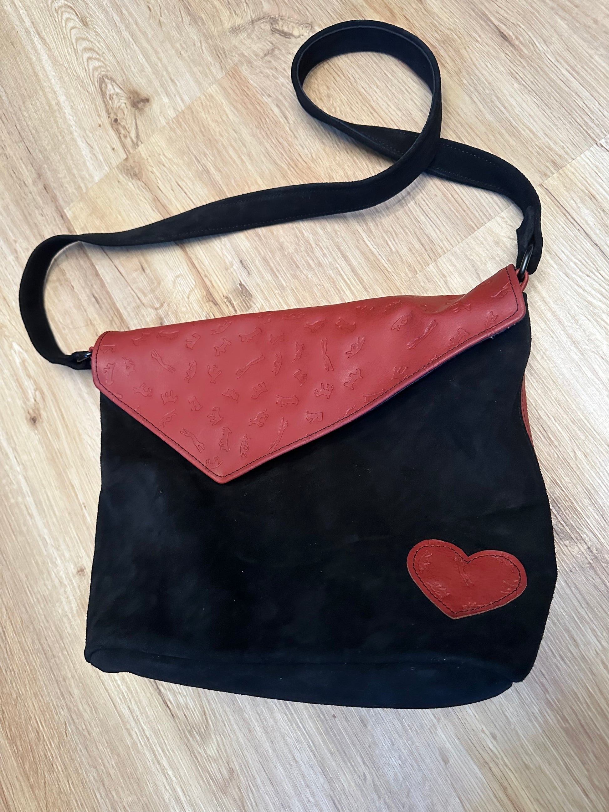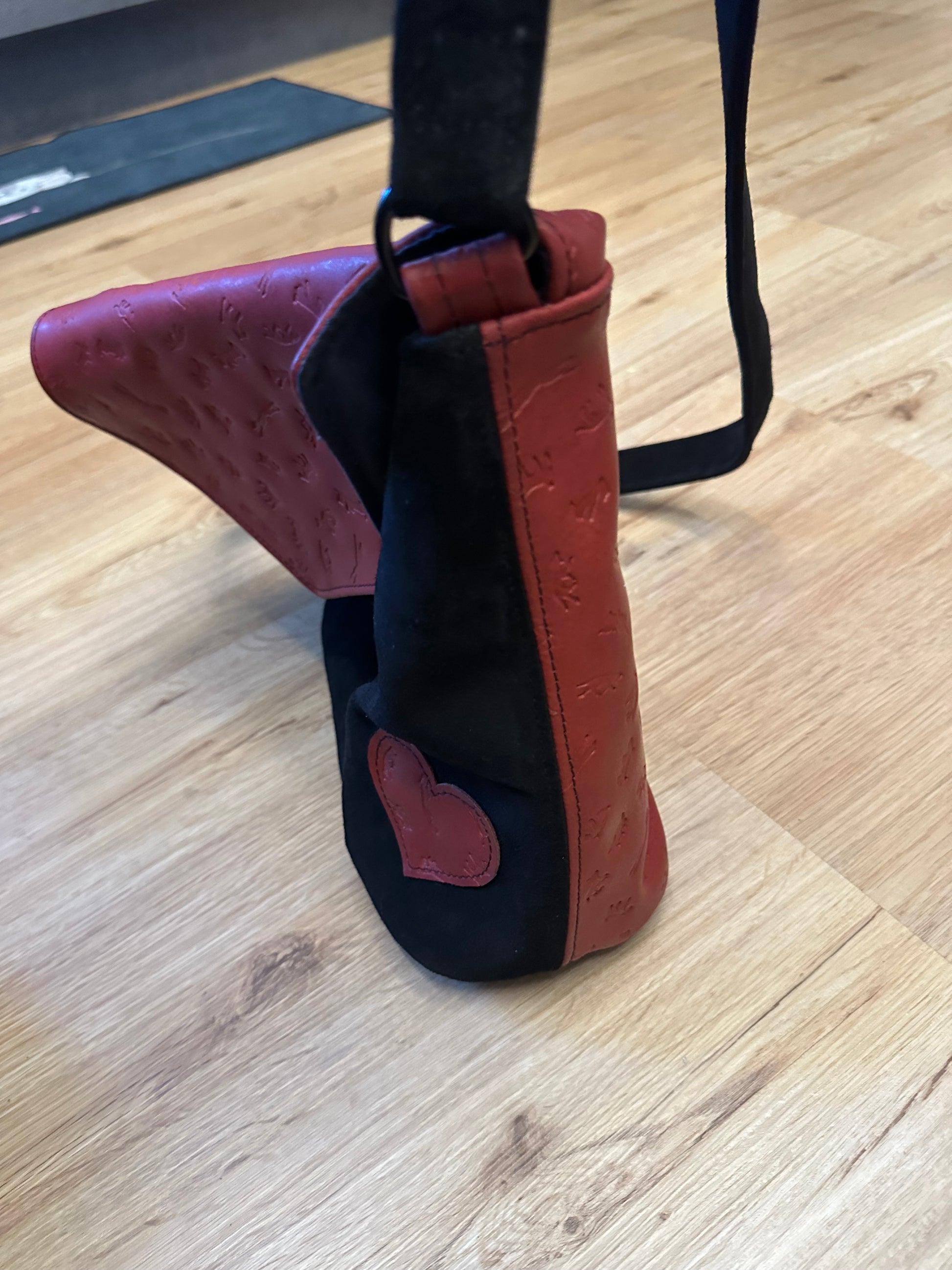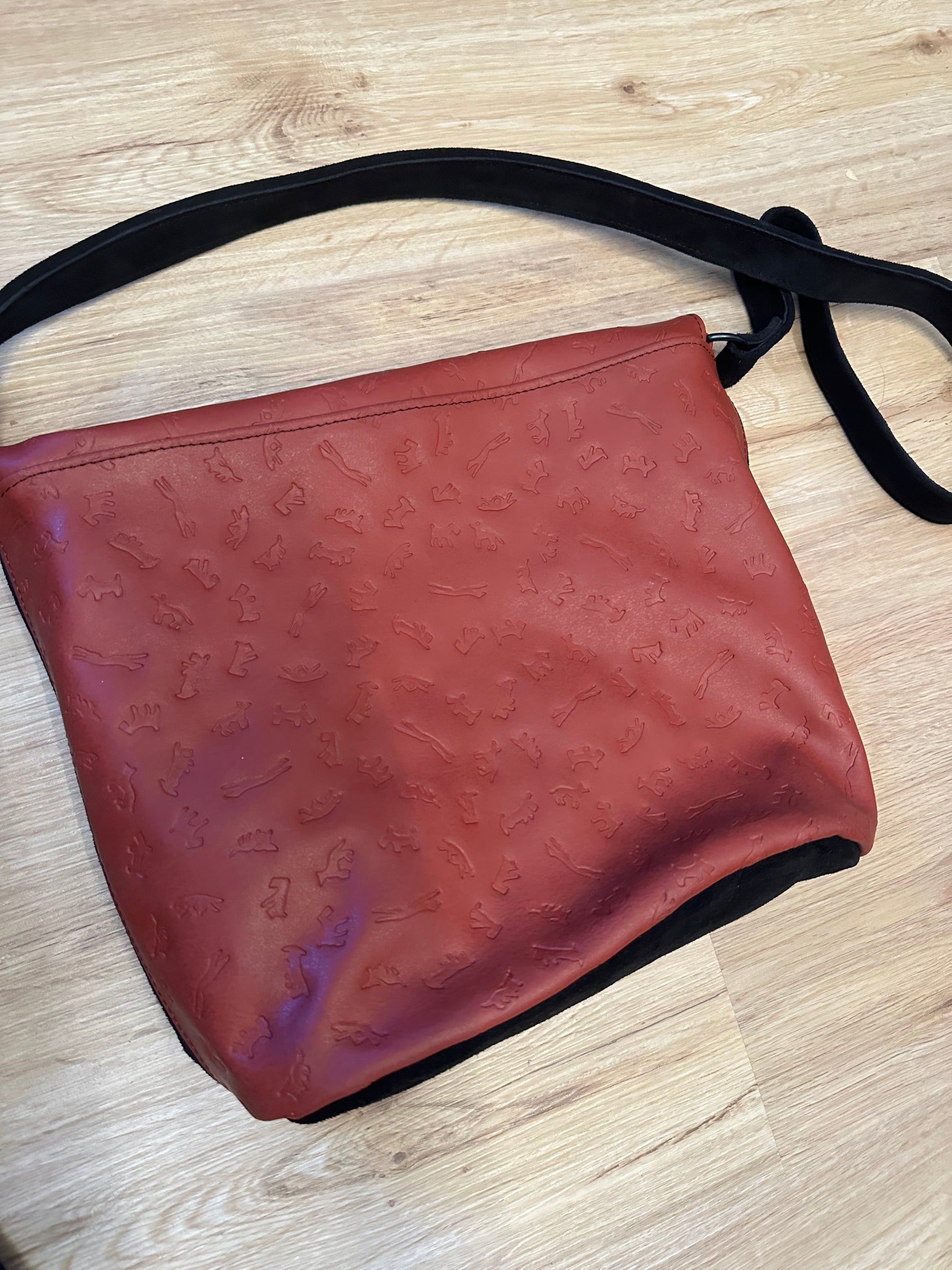 mit Innenfutter und Innentasche, Druckknopf als Verschluss, aus schwarzem und rotem Geprägten Leder
